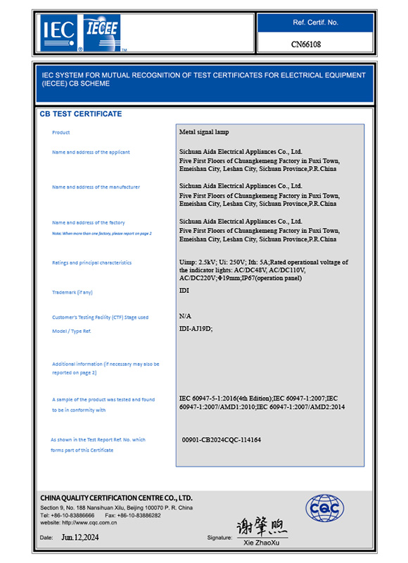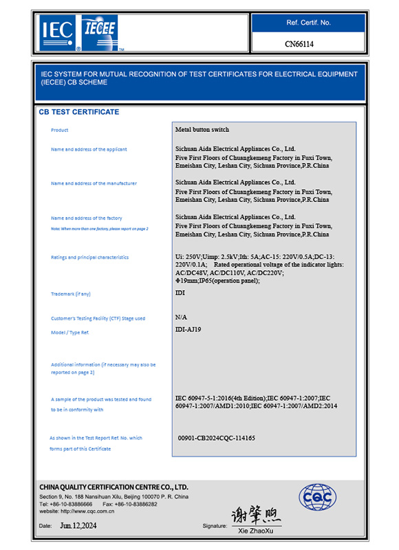 金属按钮开关IEC证书